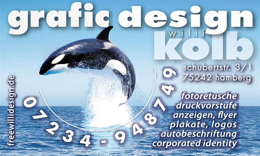 Willi Kolb, Werbung, Gestaltung, Bildbearbeitung in der Region Pforzheim / Calw. Gestaltung von Flyern, Plakaten und allen Geschäftsdrucksachen - im Sinne eines durchgehenden CI. Und alles, was sonst noch mit Werbung zu tun hat . Auch Schaufenster-, Autobeschriftung in Ihrer Nähe: Region Pforzheim / Calw. Grafiker Willi Kolb mit 30 Jahren Erfahrung im grafischen Gewerbe, inkl. Druckvorstufe und Weiterverarbeitung.